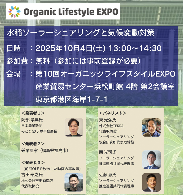 また、水稲ソーラーシェアリングの実践者をお招きし、兼業農家のリアルを語っていただき、パネルディスカッションでこれらをさらに発展させていきたいと思います。10周年のエキスポにふさわしい、新しい農業スタイルをみなさんで考え、感じる機会としていたければ幸いです。