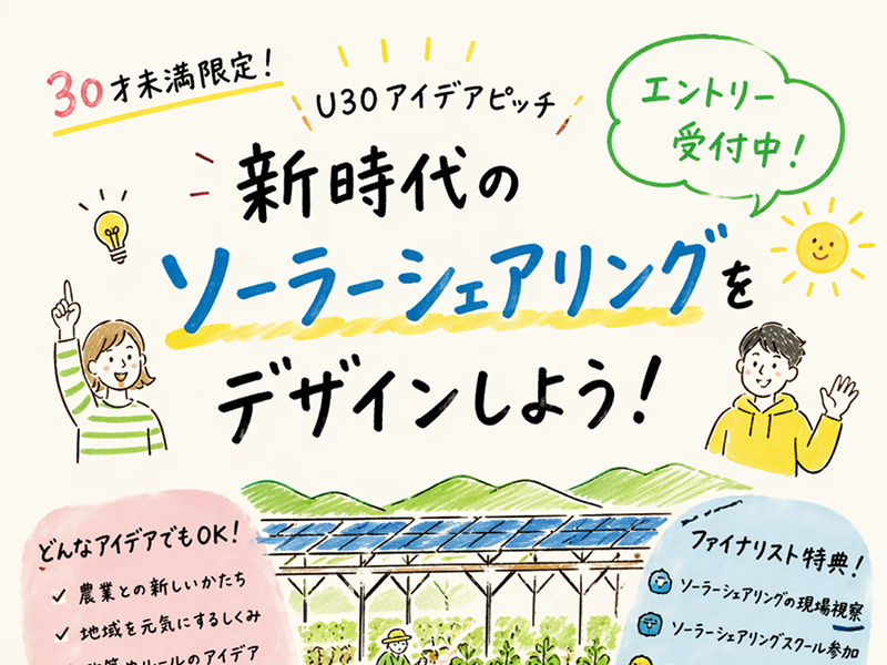 ソーラーシェアリングフェスティバル第4回全国大会にて、30歳未満の若者による、新時代の「ソーラーシェアリング」をデザインするアイデアピッチ企画を開催します。再生可能エネルギーの新しい形としても注目される「ソーラーシェアリング(営農型太陽光発電)」について、日本の農業・地域の現状を踏まえた研究や事業アイデアを募集し、優れたアイデアを表彰します。